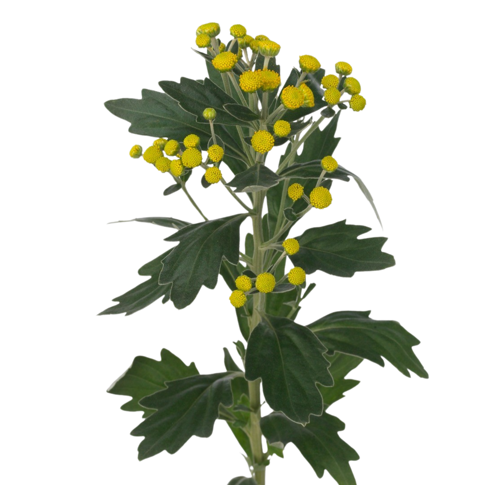 Ajania har grågröna blad och gula blommor.