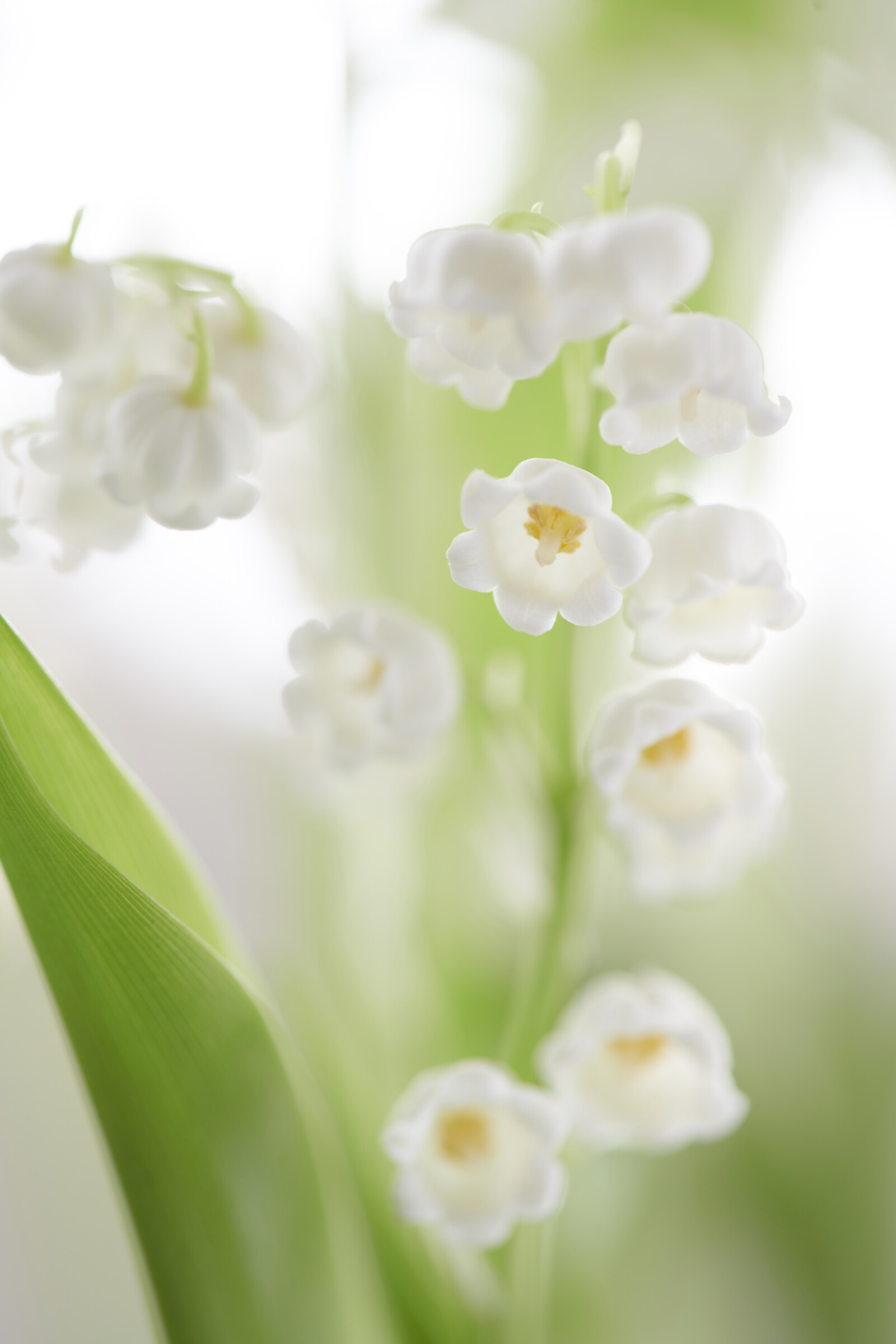 Convallaria består av små, klockformade vita blommor som hänger från en smal stjälk.