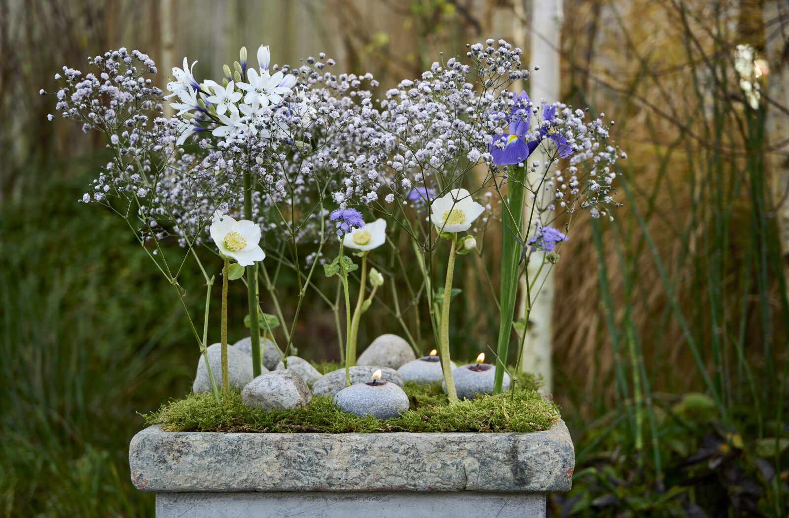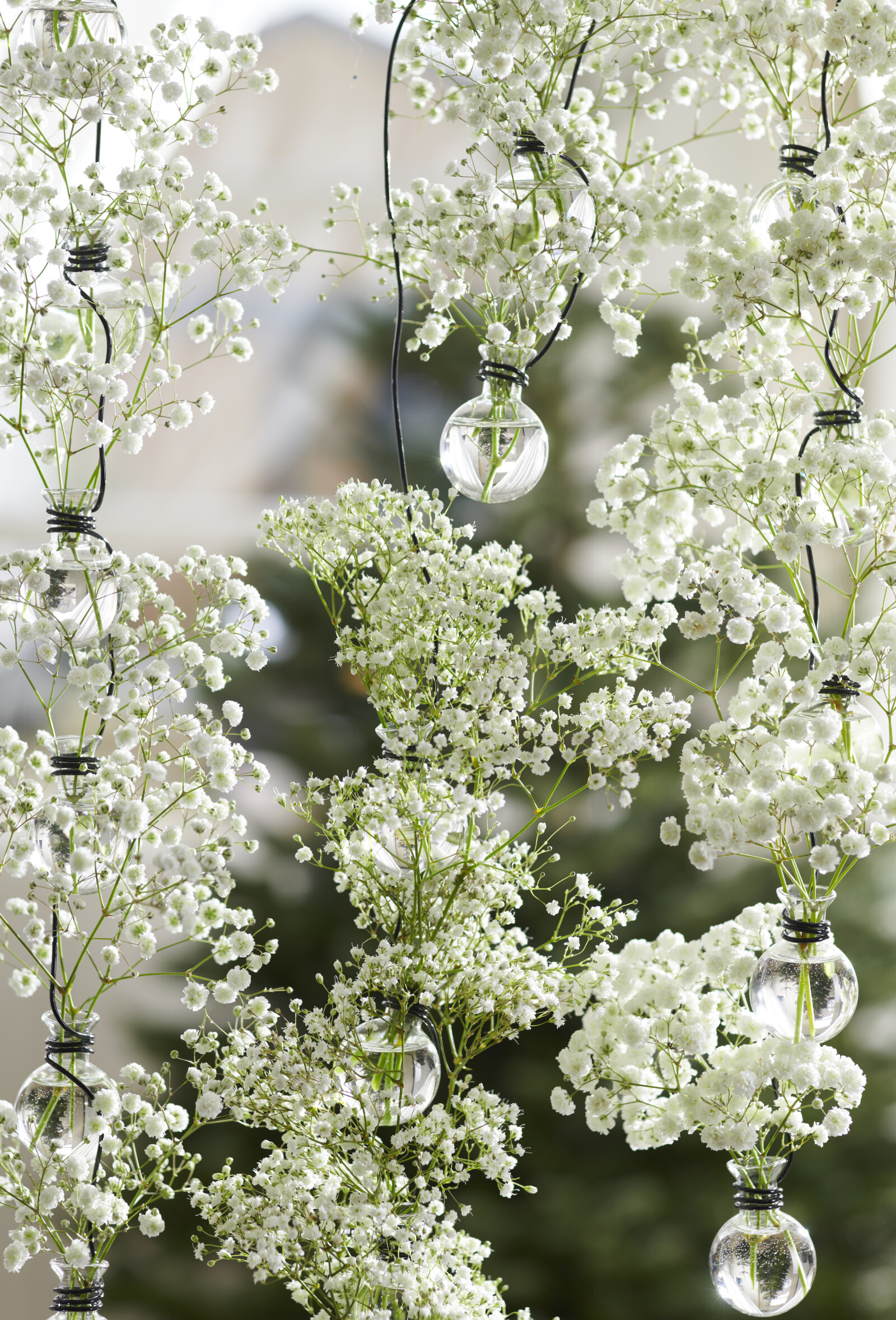 Gypsophila, även känd som baby's breath eller gypsophila, ger ett delikat och luftigt utseende tack vare de små vita blommorna som sprider sig som ett moln över stammen.