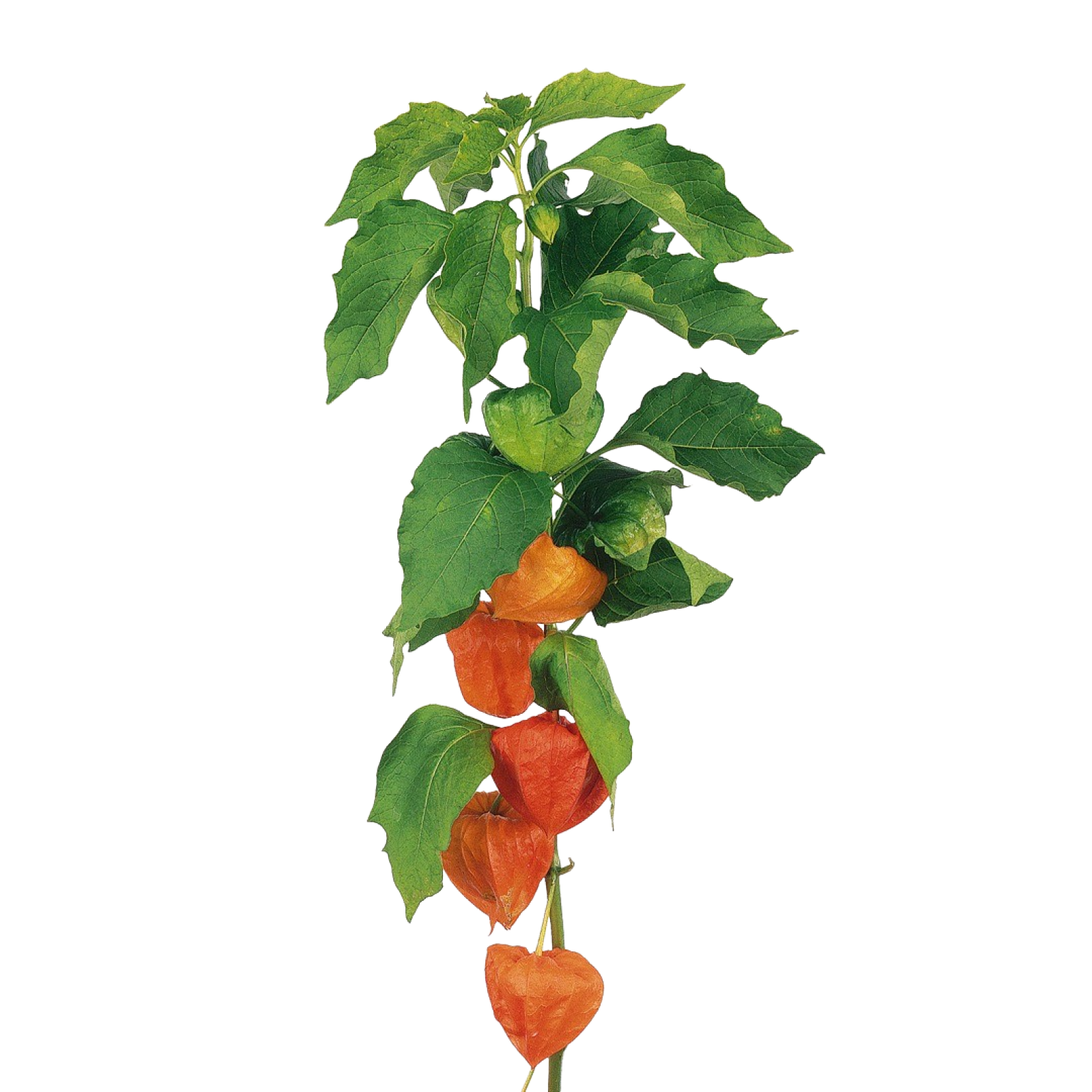 Physalis har en frisk grön stjälk med lyktor i orange färg.