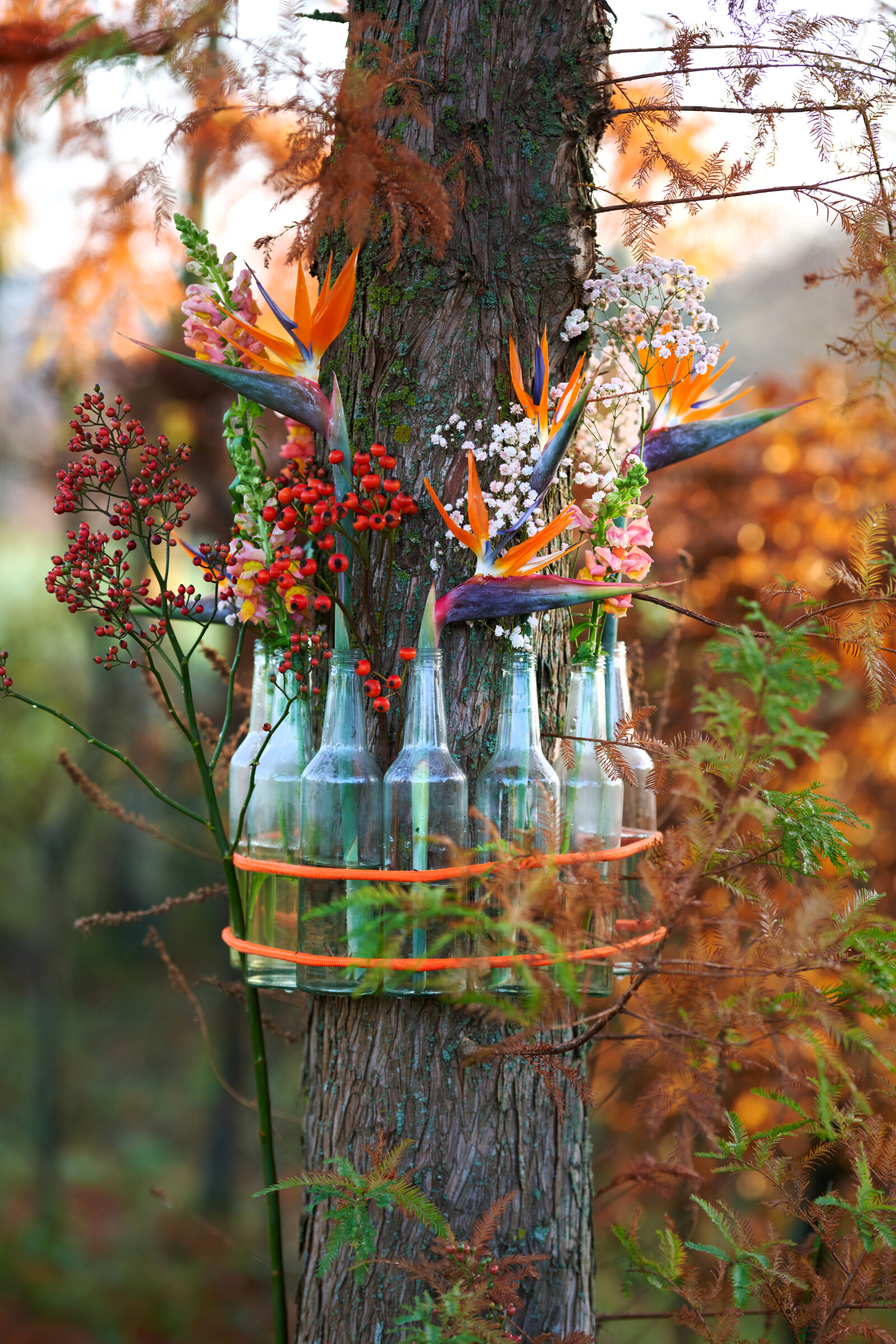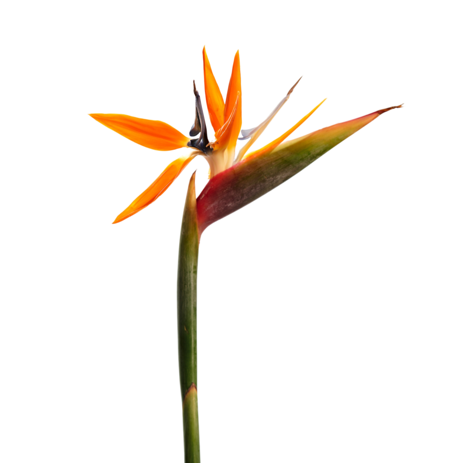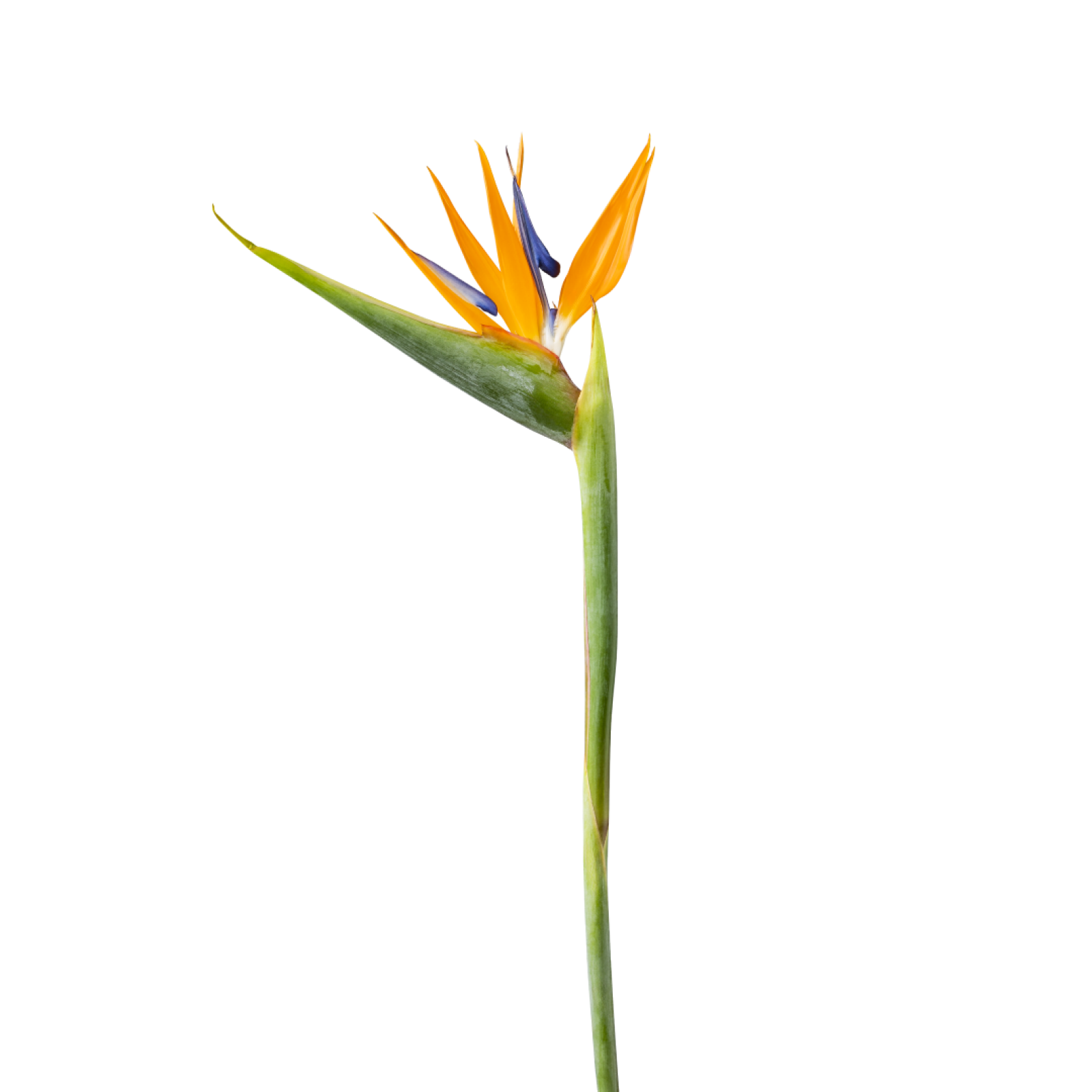 Strelitzia har ett slående och exotiskt utseende och är även känd som "paradisfågelblomman". Strelitzia liknar en paradisfågel, därav namnet. Den enkla stjälken som toppas av en kam bestående av graciösa öppna orangefärgade högblad med två till tre blå kungsblad gör att du inte lätt kommer att förbise denna fantastiska blomma