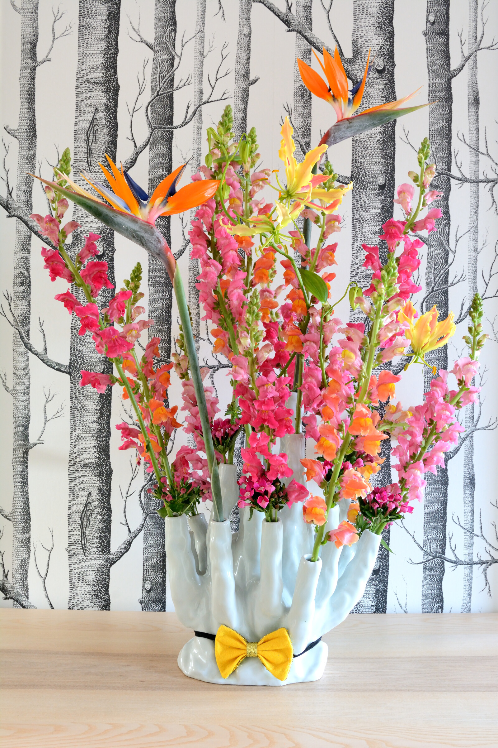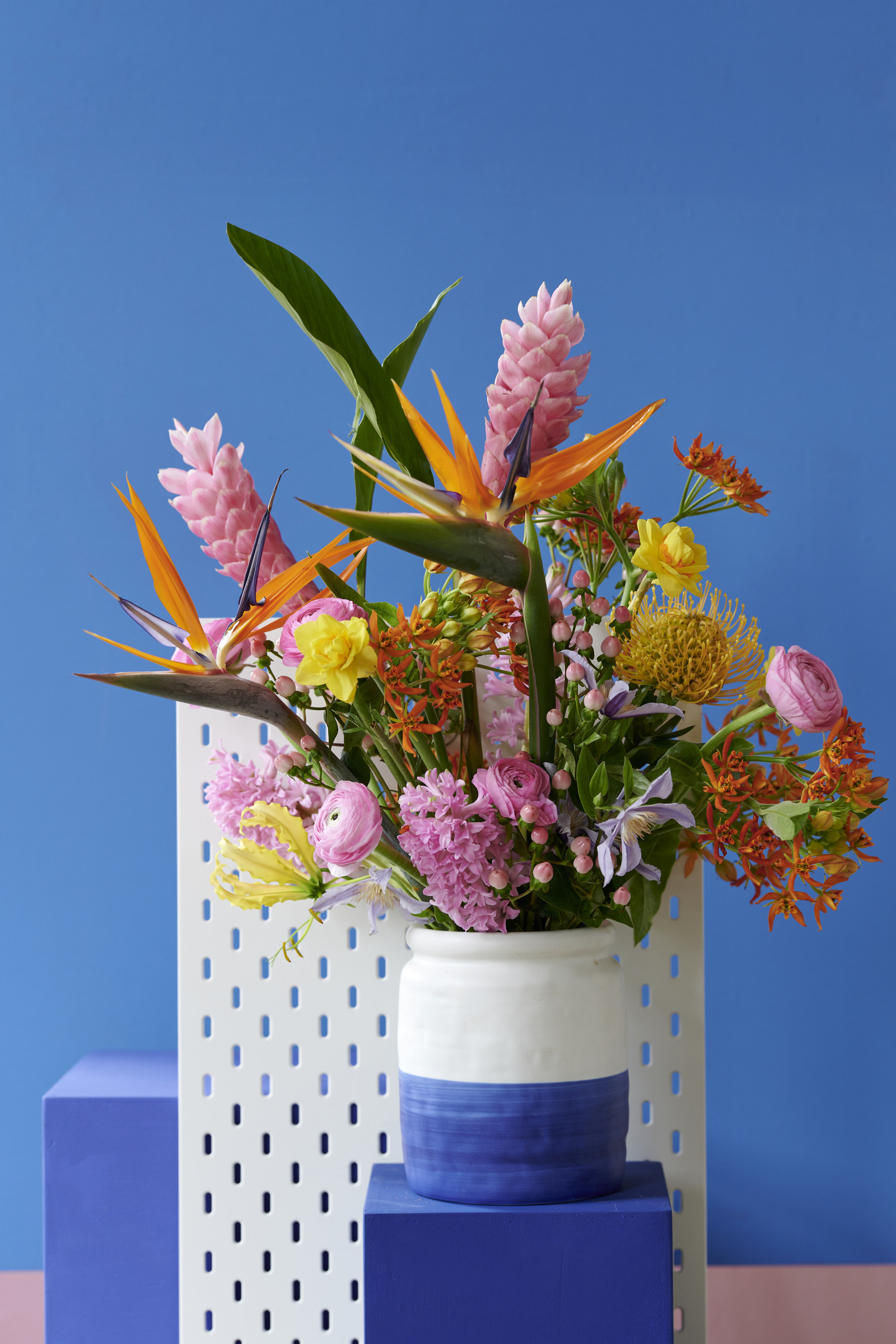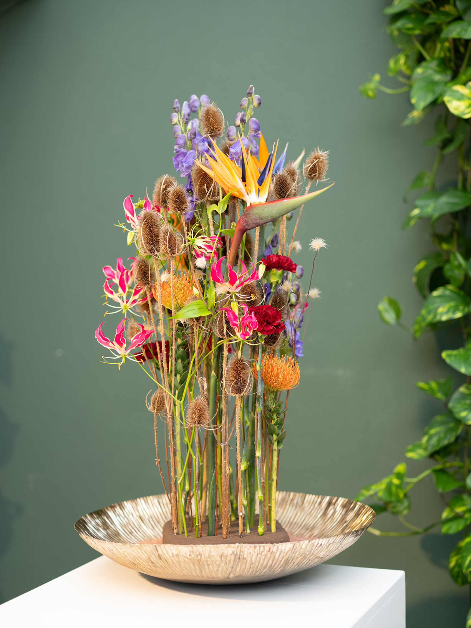 Strelitzia har ett slående och exotiskt utseende och är även känd som "paradisfågelblomman". Strelitzia liknar en paradisfågel, därav namnet. Den enkla stjälken som toppas av en kam bestående av graciösa öppna orangefärgade högblad med två till tre blå kungsblad gör att du inte lätt kommer att förbise denna fantastiska blomma